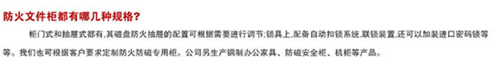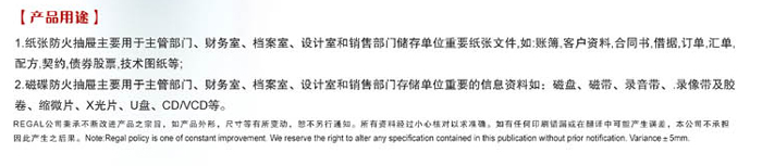 1,紙張防火抽屜主要用于主管部門,財(cái)務(wù)室、檔案室、設(shè)計(jì)室和銷售部門儲存單位重要紙張文件,如:帳簿、客戶資料、合同書、借據(jù)、訂單、匯單、配方、契約、債券股票、技術(shù)圖紙等;