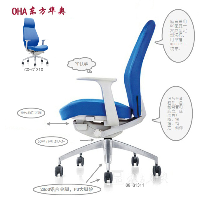 包有前后調節功能。座背采用50密度一次成型定型海棉,用華福HF008-11
